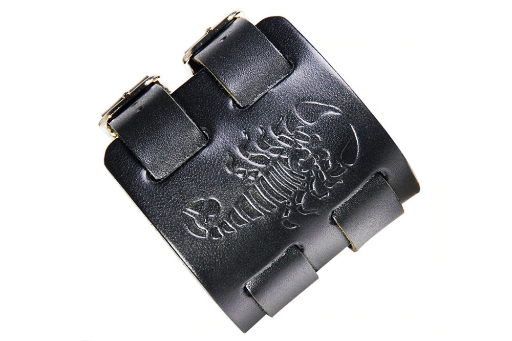 Широкий мужской браслет из кожи черного цвета, с изображением скорпиона.