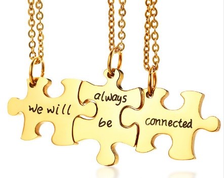 Кулон для трех подруг или друзей в виде пазлов золотистого цвета с надписью - we will always be connected - Мы всегда будем связаны!